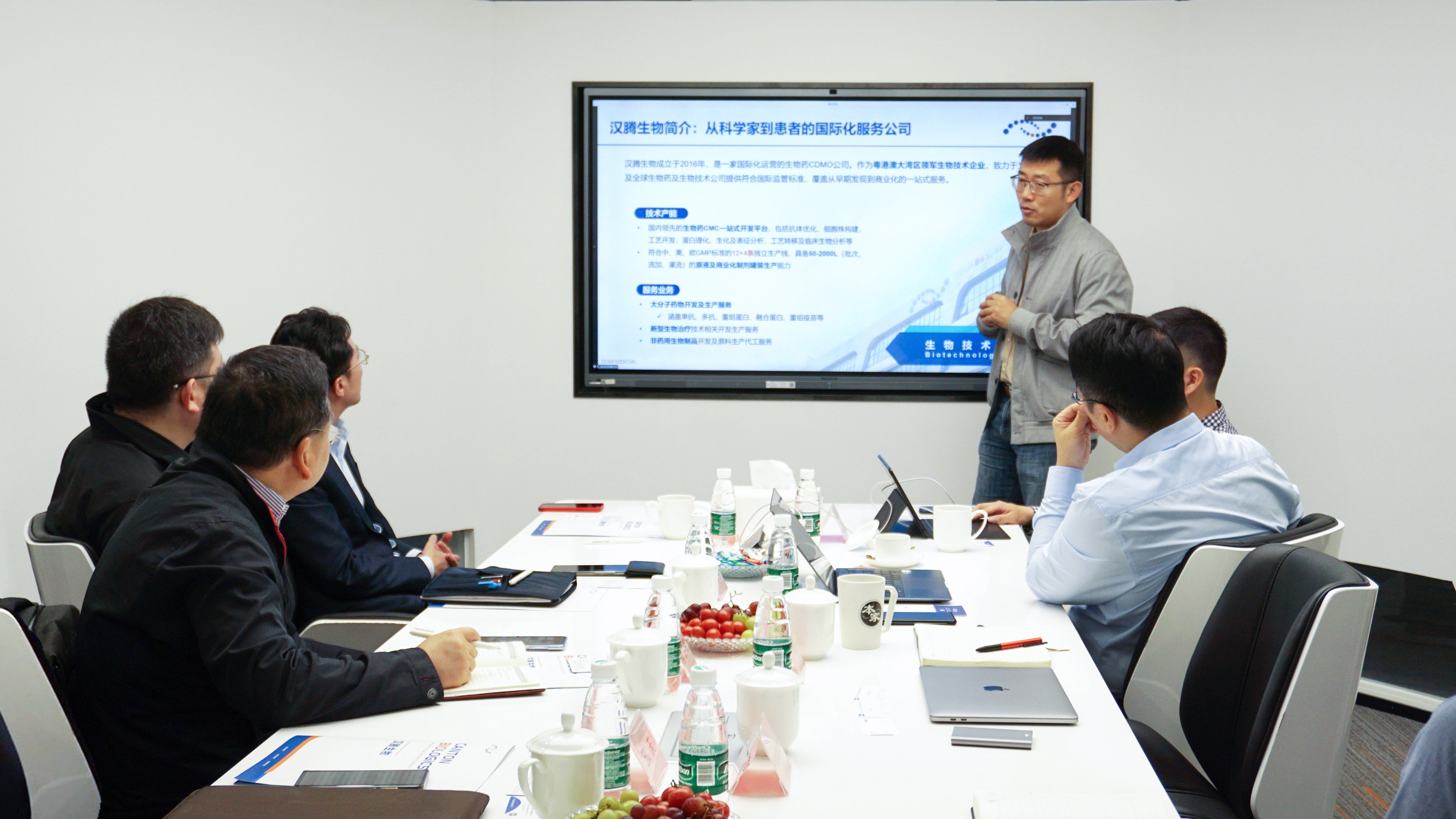 随后双方进行座谈交流,汉腾生物创始人兼CEO沈潇博士对蒋卫明主任等领导一行表示热烈欢迎,并从公司发展历程、产业布局、研发技术等方面详细介绍汉腾生物。汉腾生物是一家国际化运营的生物药CRDMSO公司,作为粤港澳大湾区领军生物技术企业,致力于为中国及全球生物药及生物技术公司提供符合国际监管标准、覆盖从早期发现到商业化的一站式服务。沈潇博士表示,希望未来汉腾生物能发展成为在地理位置、产品类型、服务流程全方位覆盖的全能型、国际化生物技术CRDMSO公司。